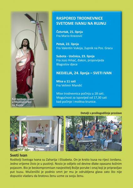 Na Rujnu, područnoj crkvi u župi Kočerin, slavi se Sveti Ivan Krstitelj. Vjernici će se za taj blagdan pripravljati Trodnevnicom. Trodnevnice počinju u četvrtak 22. lipnja. Program počinjem molitvom krunice u 17,30 sati, te slavljem Svete mise u 18 sati. Tako će biti kroz tri večeri. Prvu večer Svetu misu predvodi fra Mario Knezović, drugu večer u petak fra Valentin Vukoja, na uočnicu u subotu propovijeda đakon fra Jozo Hrkać. Na sam Ivandan Sveta misa je u 11 sati koju će predvoditi fra Velimir Mandić.